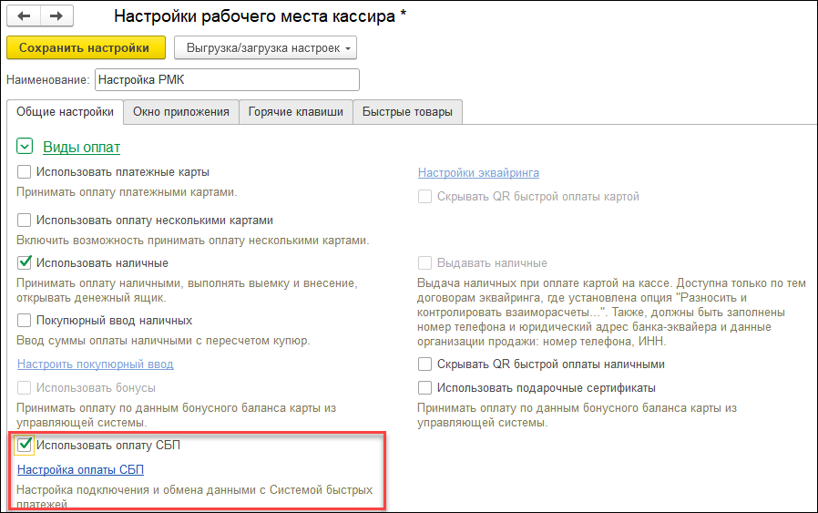 Для работы с СБП в РМК нужно в настройках РМК в разделе Виды оплат включить флажок "Использовать оплату СБП".