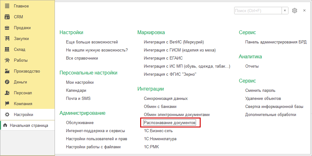 из рабочего места "Распознавание документов" или из раздела Настройки - Интеграции - Распознавание документов.