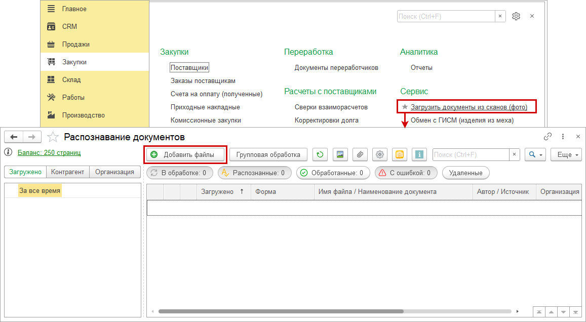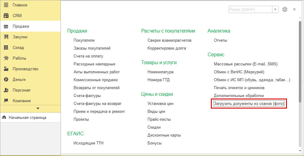 После включения настройки в меню разделов Продажи и Закупки добавляется пункт подраздела Сервис "Загрузить документы из сканов (фото)".
