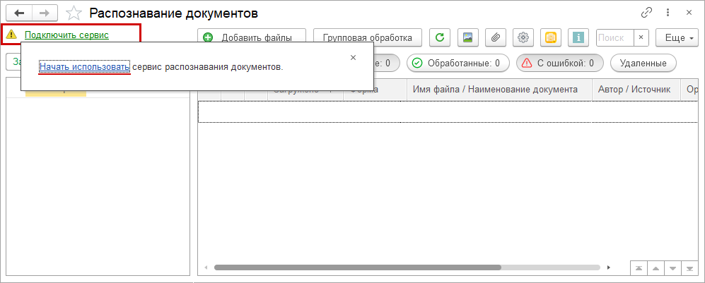 Сервис доступен в локальных версиях 1С:УНФ и 1С:Розница, а также при работе через 1cfresh.com и 1С:БухОбслуживание. Подключение к сервису "1С:Распознавание первичных документов" доступно при наличии подписки 1С:ИТС.