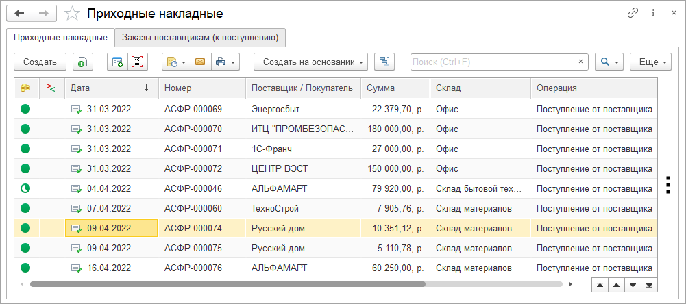 Ввод входящих документов от поставщика: