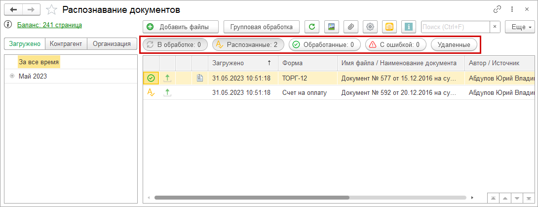 Когда документы распознаются, статус изменится на "Распознан".