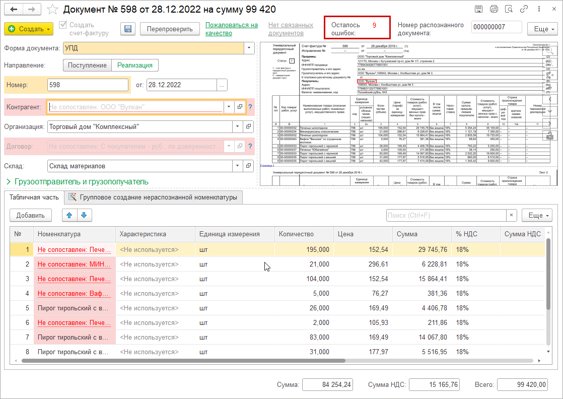В результате распознавания определяется форма документа и направление (поступление/реализация), заполняются реквизиты шапки и табличной части документа.