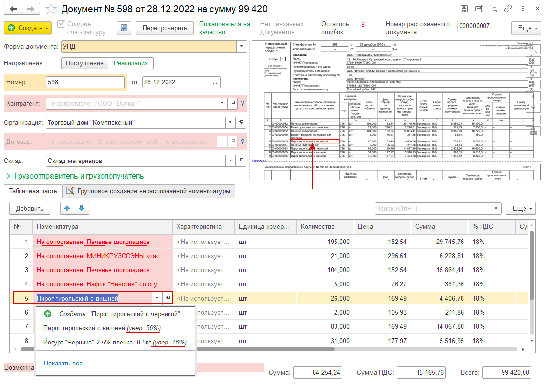Если объект найден в базе "не уверенно", например название номенклатуры у поставщика в скане немного отличается от названия в информационной базе, реквизит заполняется, но становится подсвеченным. Также подсвечиваются ячейки, участвующие в расчете суммы, если в распознанном документе не сходится сумма.
