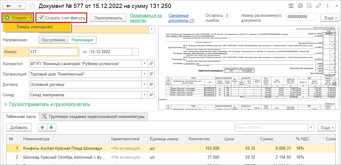 После успешной проверки и исправления ошибок можно создать документ в информационной базе.