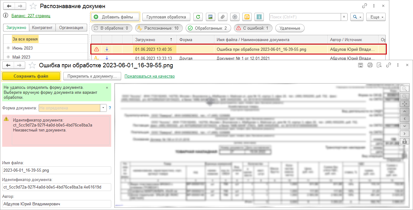 При успешном проведении документа откроется следующий результат распознавания, по которому еще не создан документ. В случае если проведение не удалось, откроется форма записанного документа для анализа.