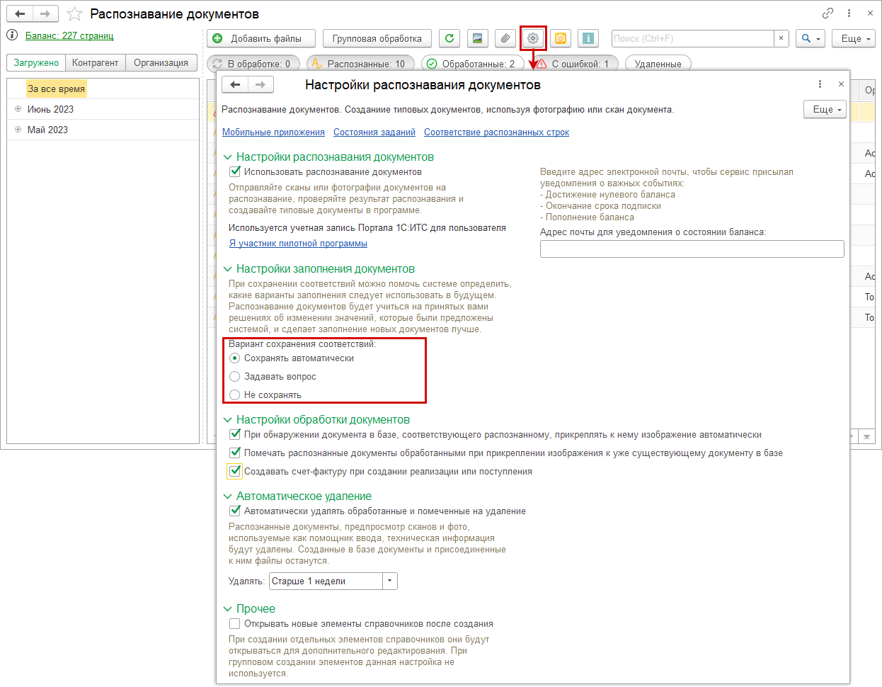 Также в настройках распознавания можно включить дополнительные автоматические действия при обработке документов, и подключить автоматическое удаление устаревших сканов.