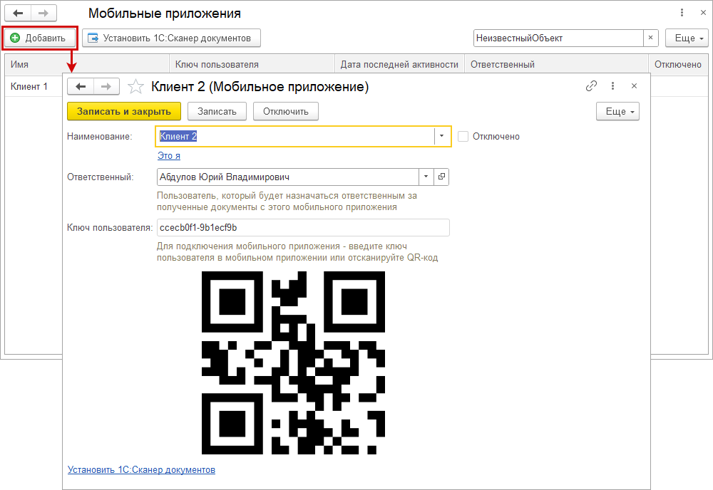 В окне отображается ключ пользователя и QR-код для подключения мобильного приложения.
