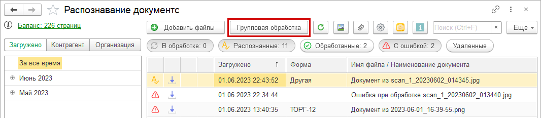 Режим групповой обработки запускается по кнопке "Групповая обработка" в рабочем месте "Распознавание документов".