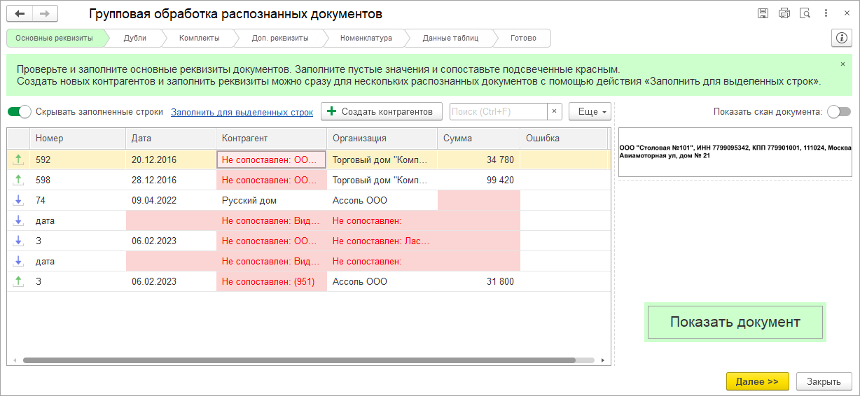Шаг 1. Проверьте и заполните недостающие реквизиты шапки, подсвеченные красным. Предусмотрено создание новых контрагентов сразу для нескольких документов по кнопке "Заполнить для выделенных строк".