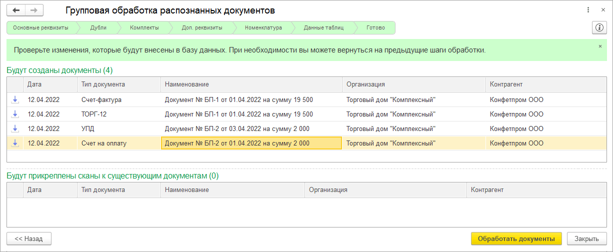 Шаг 7. Подтвердите изменения, которые будут внесены в результате обработки и нажмите "Обработать документы". Будут созданы новые документы в 1С с прикрепленными к ним сканами.