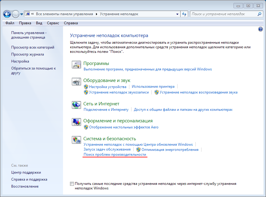 - В разделе Система и безопасность выберите пункт Поиск проблем производительности.