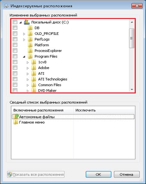 - В появившемся диалоговом окне «Индексируемые расположения» снимите галочки со всех пунктов в дереве Изменение выбранных расположений. Затем нажмите ОК.