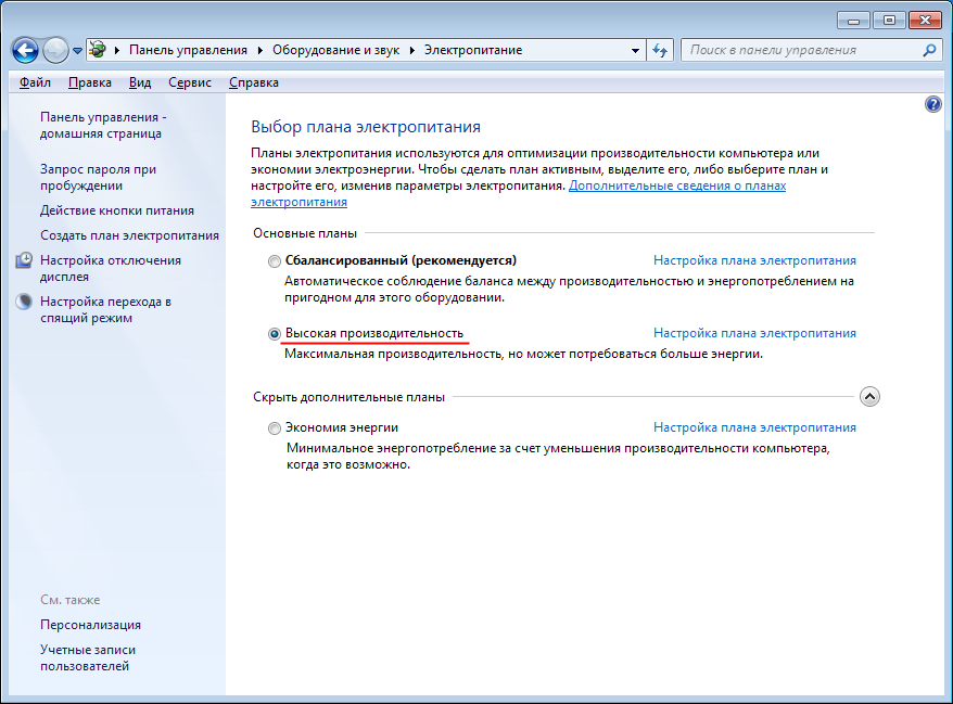 - Выберите план Высокая производительность.