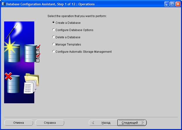 На первом шаге выберите создание базы данных Oracle (Create a Database). Для продолжения нажмите Следующий >.