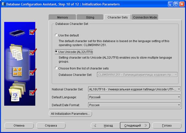 На десятом шаге задаются параметры базы данных Oracle. Объем памяти, доступной для данной базы данных Oracle, можно задать как в процентах от общей физической памяти сервера, так и более детально (выбрав пункт Custom и установив параметры SGA Size и PGA Size).