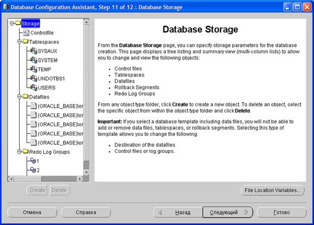 На одиннадцатом шаге можно скорректировать расположение файлов базы данных Oracle, задать размер логов REDO, а также создать табличные пространства. Создавать табличные пространства для платформы "1С:Предприятие 8.2" нет необходимости, т. к. платформа создаст их автоматически при создании первой информационной базы.