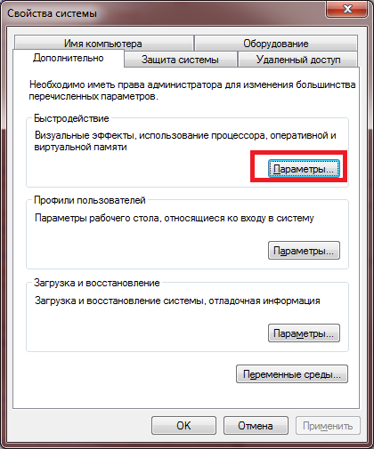 Управление файлом подкачки осуществляется через дополнительные параметры системы в свойствах компьютера. Нажимаем кнопку Параметры в секции Быстродействие.
