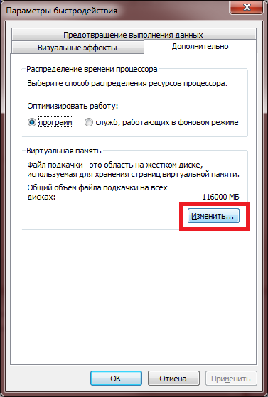 В открывшемся окне на вкладке Дополнительно находим секцию Виртуальная память и нажимаем кнопку Изменить.