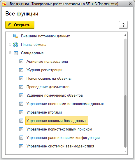 Для управления копиями баз данных необходимо через меню Все функции вызвать соответствующую стандартную обработку.