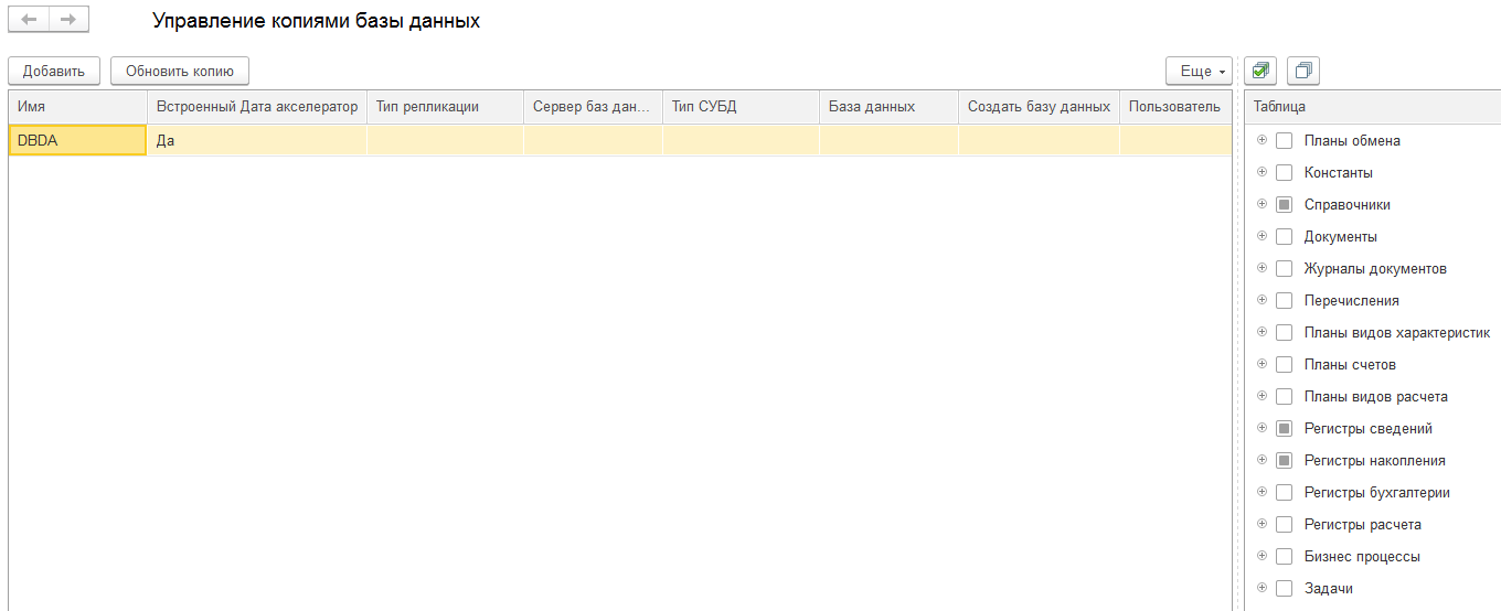 В открывшемся окне можно управлять копиями баз данных и составом метаданных, хранящихся в них.