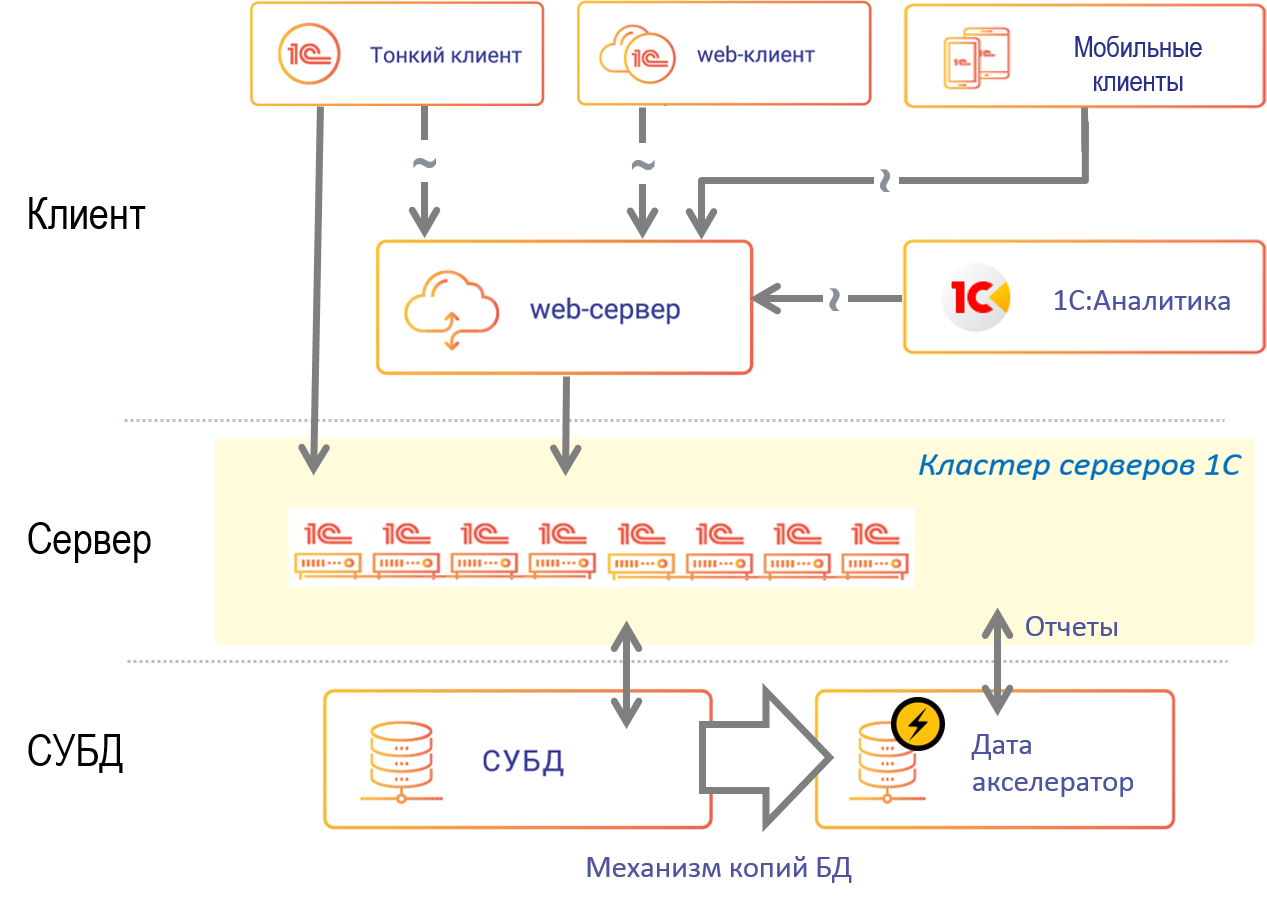 Дата акселератор – это отдельная СУБД класса ROLAP, в которой может храниться копия данных. ROLAP означает, что для платформы 1С эта база данных выглядит как реляционная СУБД, но сама база данных оптимизирована для быстрого выполнения именно аналитических запросов. Если посмотреть, что "под капотом" у Дата акселератора, то ускорение в десятки раз обработки аналитических данных достигается за счет следующих технологий: