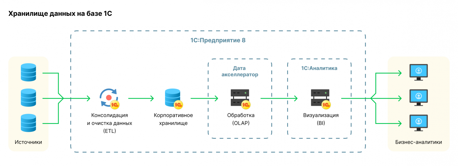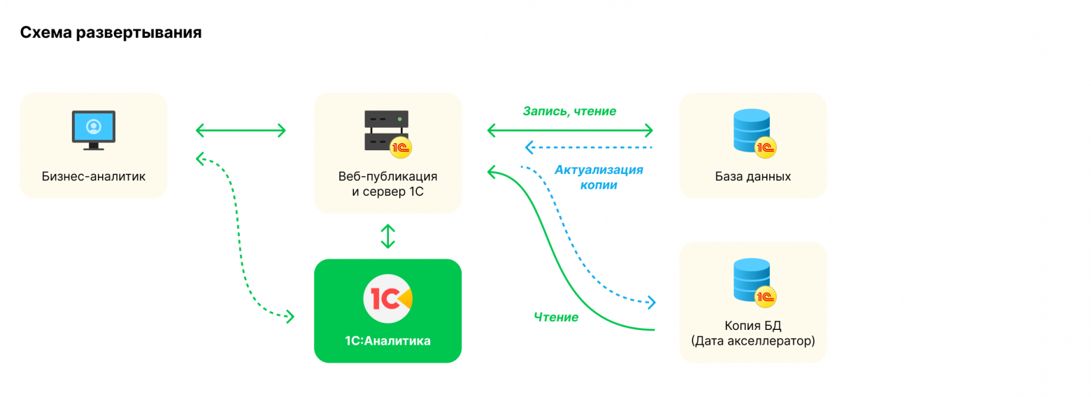 Если посмотреть на общую схему развертывания 1С:Аналитики со всеми нужными компонентами платформы, то мы увидим, что здесь есть аналоги для всех компонентов из классической схемы построения аналитических систем, но важное отличие, что все они работают внутри и являются частью платформы 1С:Предприятие.