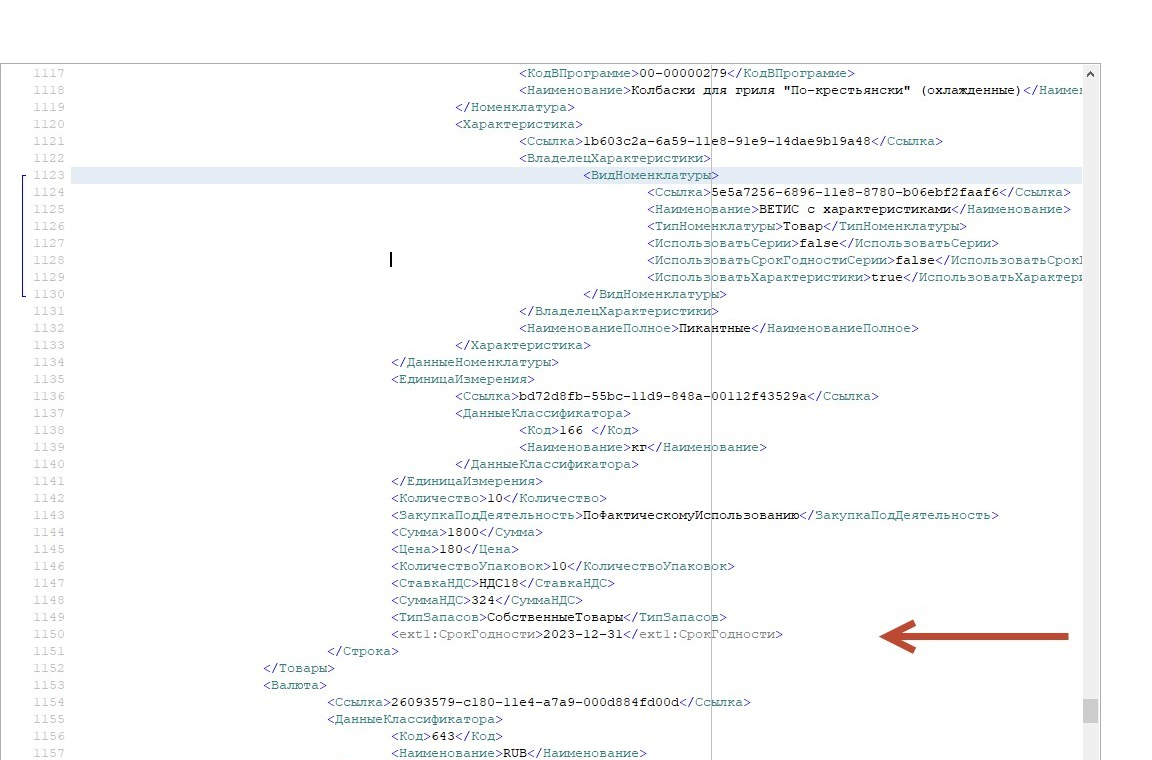 Если все предыдущие пункты выполнены правильно, то выгруженная номенклатура в файле сообщения будет содержать данные по расширенным свойствам. При этом такие узлы будут маркироваться соответствующим URI.