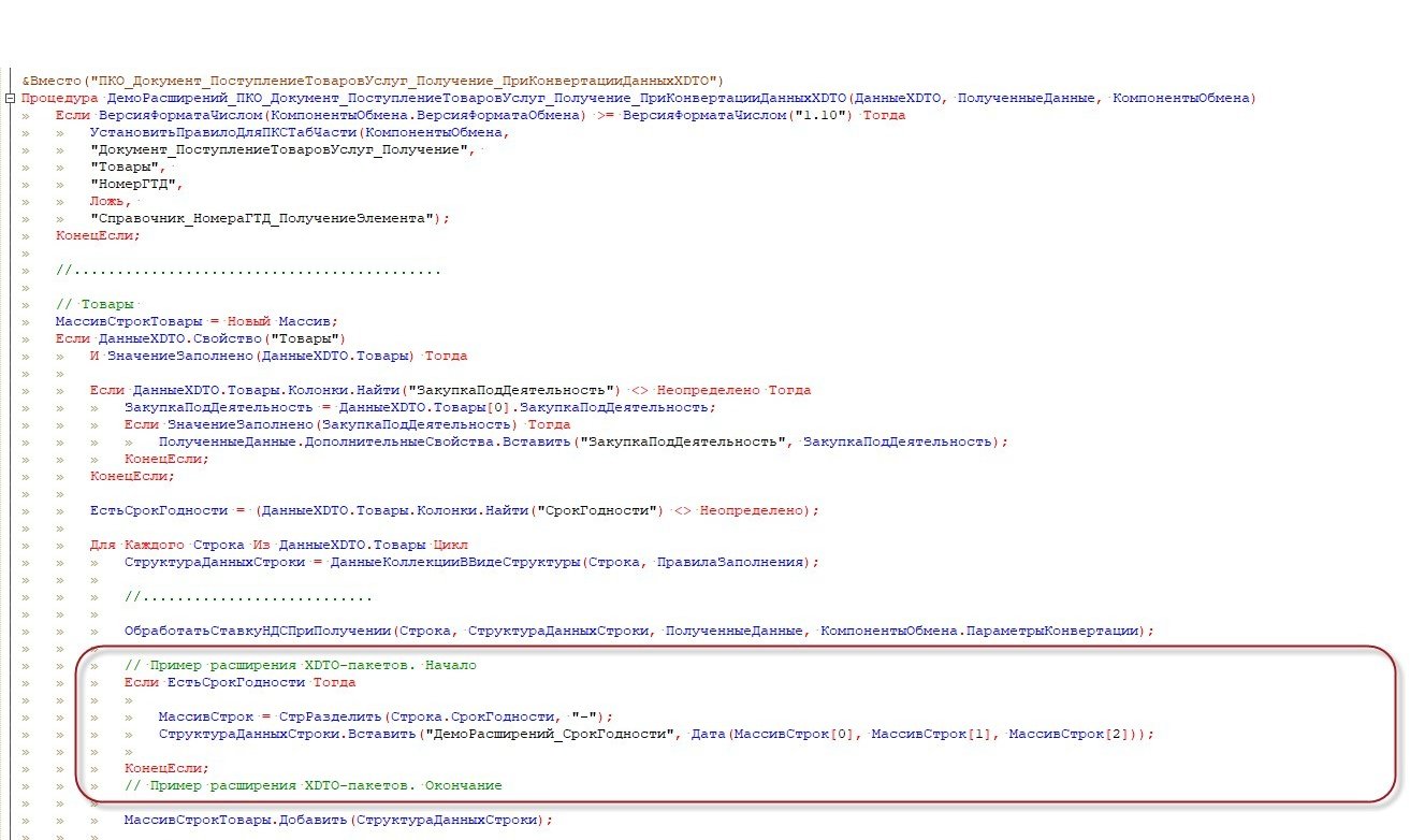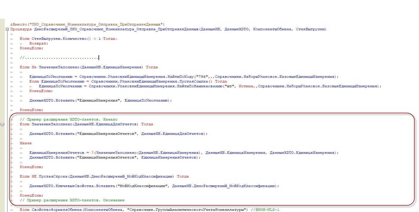Далее нам необходимо добавить в процедуру выборки данных новое поле. Для этого нужно изменить алгоритм ПТиУ_РасширенныеДанныеИБ(), который вызывается при работе обработчика ПриОтправкеДанных выгрузки документа. Поскольку алгоритм большой, то в статье демонстрируется только одна из правок.