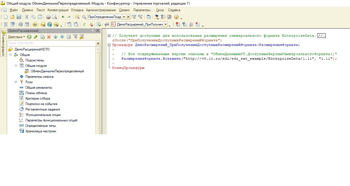 После того, как свойства добавлены, нужно прописать наш XDTO-пакет в системе. Для этого нужно перейти в общий модуль ОбменДаннымиПереопределяемый и поправить процедуру ПриПолученииДоступныхРасширенийФормата. Чтобы не снимать с поддержки модуль процедуру необходимо добавить в расширение.