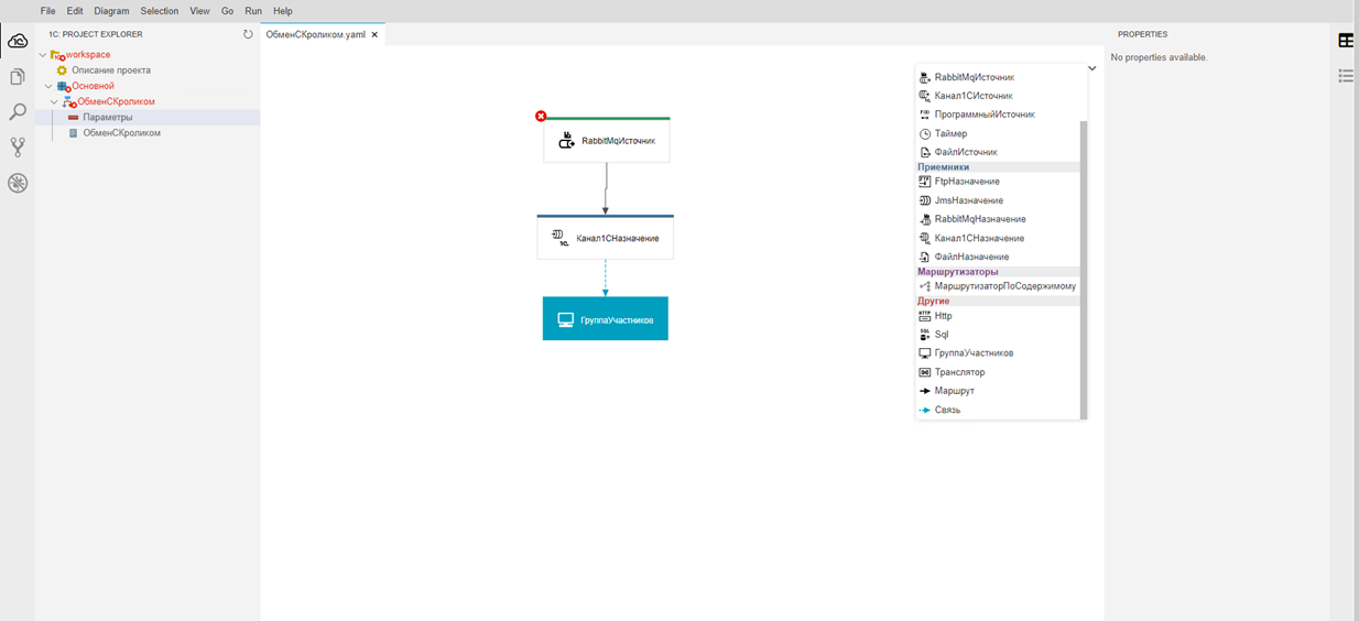 - На схеме выберите узел RabbitMqИсточник и в правом нижнем углу нажмите Параметры.