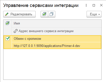 В списке доступных сервисов интеграции вы увидите единственную запись Обмен с кроликом — этот тот самый сервис интеграции, который вы создали в Конфигураторе.