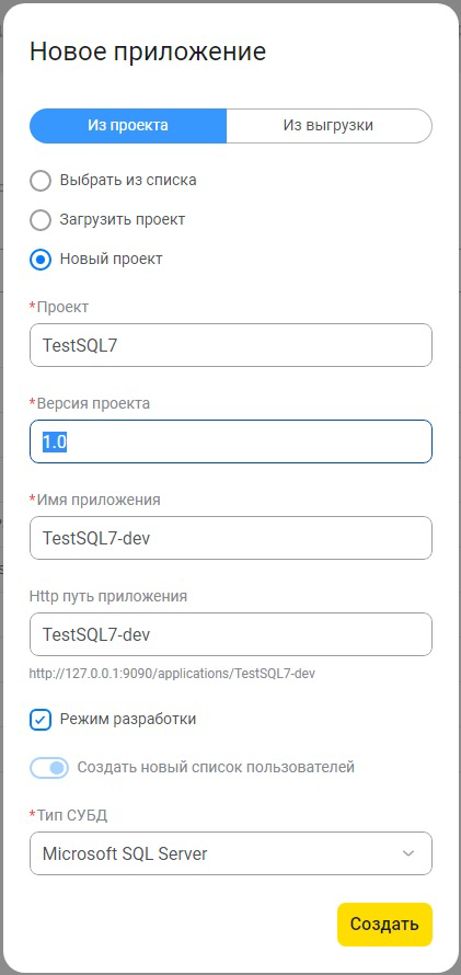 Указать режим разработки, выбрать тип СУБД (в нашем примере это будет Microsoft SQL Server) и нажать кнопку "Создать". Пример настройки приложения: