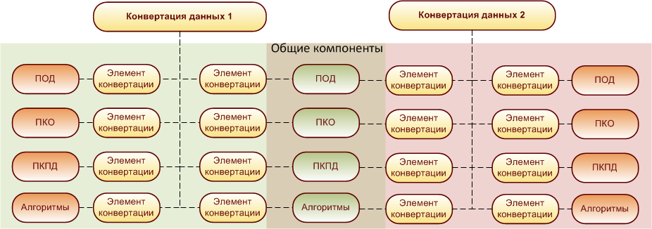 Процесс разработки конвертации в КД3.0 осуществляется по принципу компоновки элементов конвертации. Для упрощения параллельной разработки нескольких обменов данными в КД3.0 предусмотрена возможность использования общих элементов конвертации: ПОД, ПКО, ПКПД, алгоритмов (см. рисунок):
