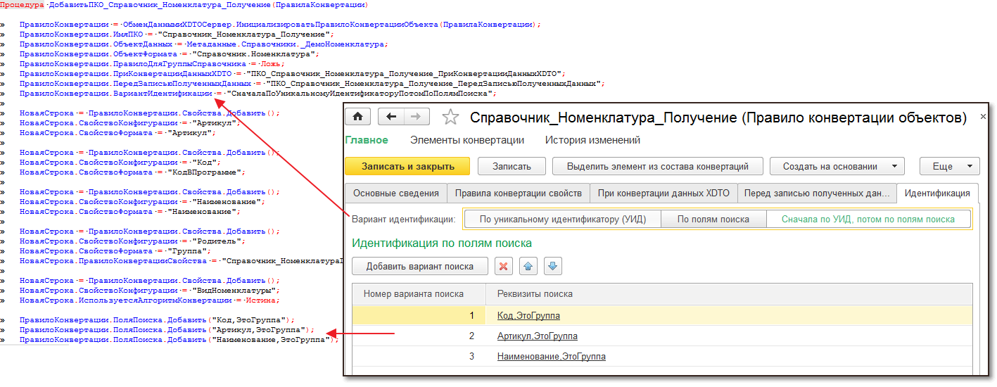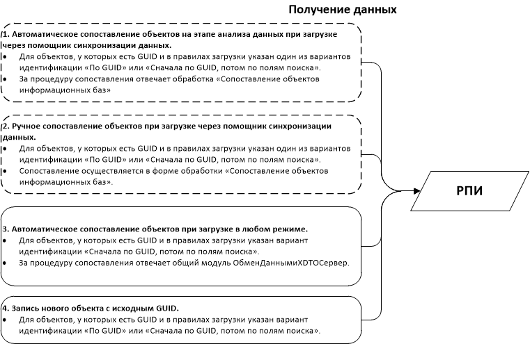Прикладная логика, определяющая порядок автоматического сопоставления объектов при получении, содержится в правилах конвертации объектов (ПКО), предназначенных для получения данных.
