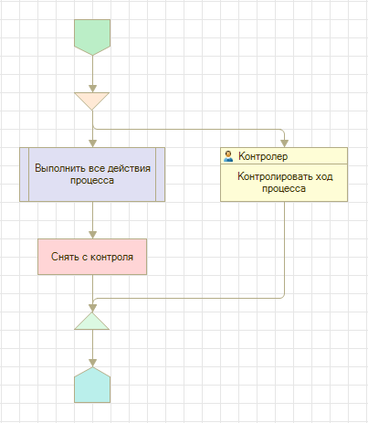 Такой подход встречается в процессах Приглашение, Рассмотрение, Регистрация, Согласование, Утверждение. Поведение обусловлено тем, что в случае положительного выполнения процесса (например, все согласовано, замечаний нет) автору больше не нужно ничего делать с предметами, и процесс можно считать завершенным. Это справедливо тогда, когда вышеперечисленные процессы являются частью комплексного процесса и их положительное завершение не должно зависеть от автора процесса. То есть если процесс завершился положительно, то комплексный процесс должен перейти к следующим действиям. Реализуется это путем переноса создания задачи ознакомления в точку маршрута Завершение (см. пример).