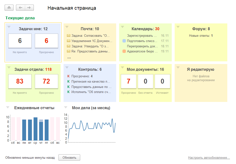 Для работы виджета "Мои дела" ежедневно (один раз в день, в 8.00) рассчитываются показатели регламентным заданием РасчетПоказателейРаботыПользователей и помещаются в регистр сведений ЗначенияПоказателейРаботыПользователя. В течение дня этот виджет не меняет показания.