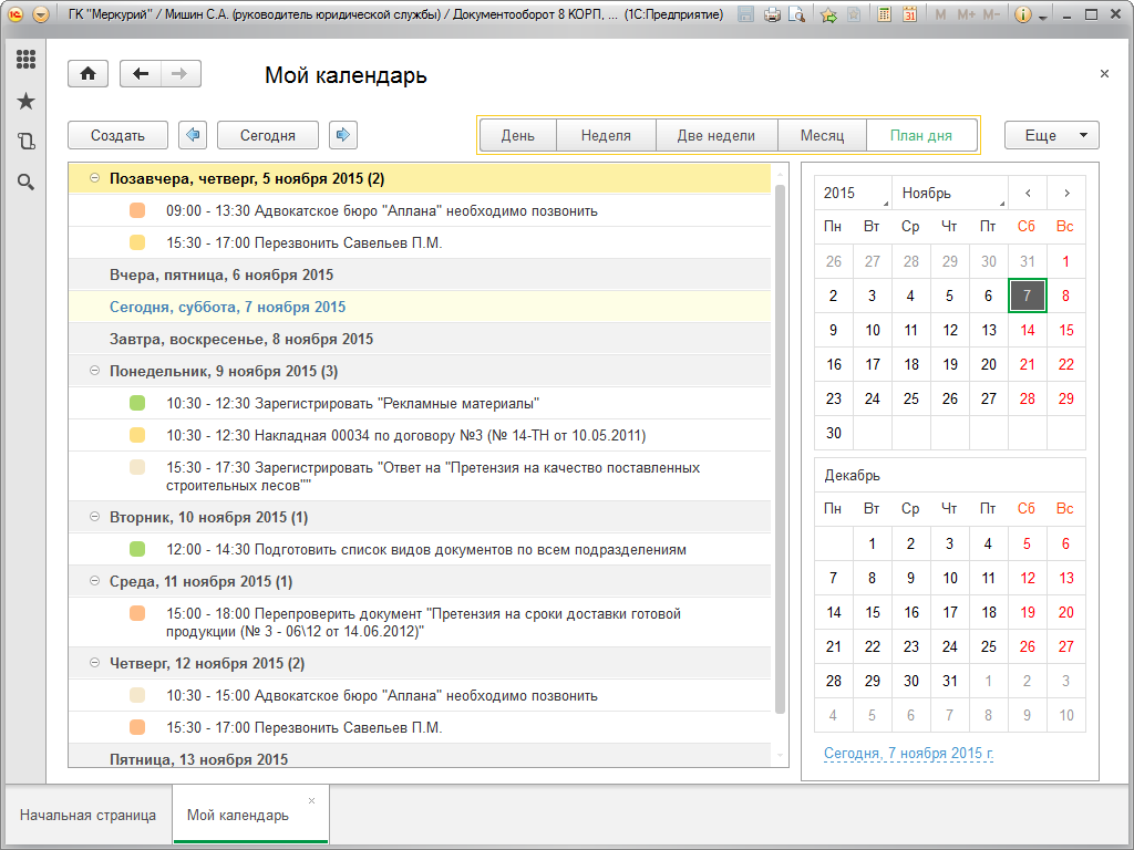 Одним из вариантов отображения календаря является план дня – в этом случае календарь отображается в виде дерева значений. Данное отображение используется в календаря для вида План дня и для формы ближайших событий на рабочем столе.