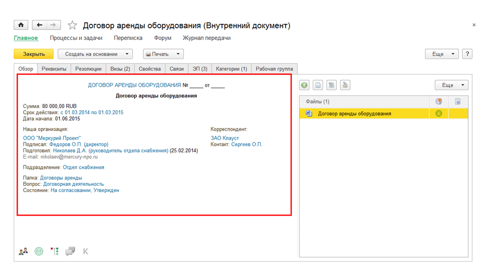 Практически все реквизиты, представленные в превью, являются ссылками, причем клик на разные данные порождает различные действия. Например, клик по электронной почте открывает форму создания письма на указанный адрес. Обработчик нажатия на реквизиты превью находится в общем модуле ДелопроизводствоКлиент ОбработатьНажатиеНаПолеОбзор. В настоящий момент процедура умеет отправлять письма, открывать сайты, переходить в формы различных справочников, а также открывать документ на нужной вкладке (например, может открыть закладку "Этапы" документа).