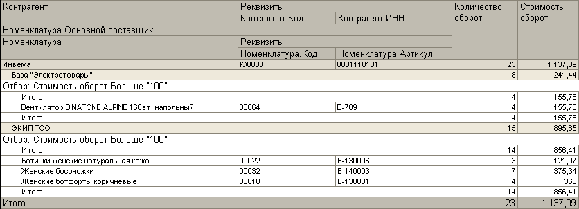 Также стоит заметить, что отбор, применяемый в группировке, влияет на отображение общего итога по данной группировке. Например, в указанном ниже отчете для группировки Номенклатура установлен отбор. Соответственно, в общем итоге по группировке Номенклатура указаны количество и стоимость с учетом отбора, тогда как для вышестоящей группировки Номенклатура.Основной поставщик указывается количество и стоимость без учета отбора.