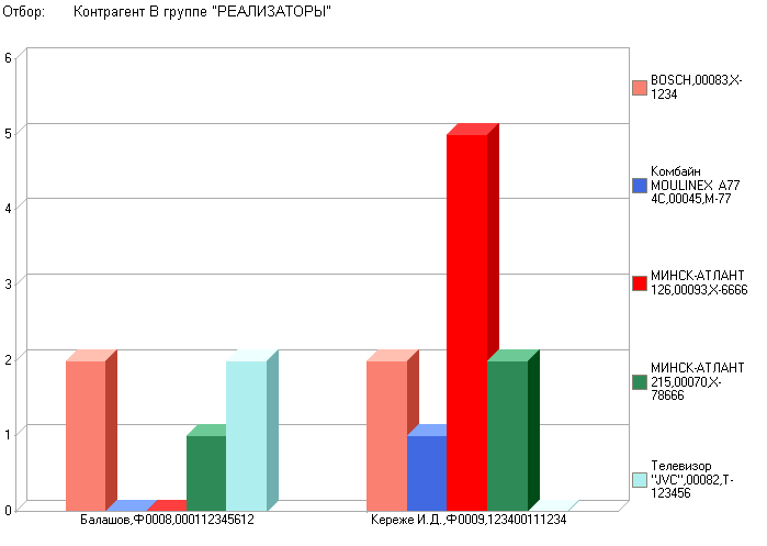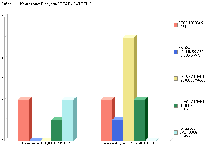 В данной диаграмме видно, что у контрагента Кереже И.Д. по номенклатуре МИНСК-АТЛАНТ продажи составили больше 4 единиц.
