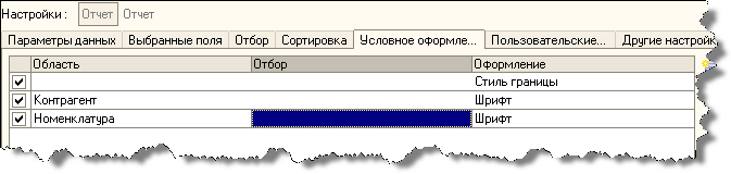 Порядок обработки элементов условного оформления следующий: сначала обрабатывается условное оформление группировок, затем обрабатывается условное оформление таблиц или диаграмм и в конце обрабатывается условное оформление всего отчета.