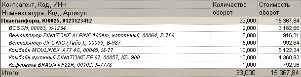 Поясним использование условных оформлений на следующем примере. Предположим, существует отчет о продажах, содержащий группировки Контрагент и Номенклатура. В данном отчете необходимо выделить жирным шрифтом - строки, отображающие контрагентов, наклонным шрифтом - строки, отображающие номенклатуру. При этом, если количество проданного товара больше 5, то необходимо отображать текст в полях КоличествоОборот и СтоимостьОборот красным цветом. Стиль рамки в отчете требуется изменить на пунктирный.