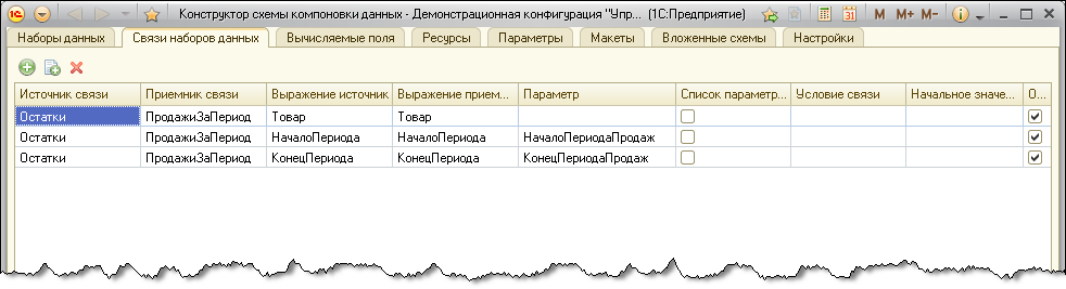 Из описания связей видно, что для записей набора данных Остатки будут получаться записи набора данных ПродажиЗаПериод для нужного периода и нужных товаров. При этом значения полей НачалоПериода и КонецПериода набора данных Остатки будет использоваться в качестве значений параметров виртуальной таблицы Обороты.