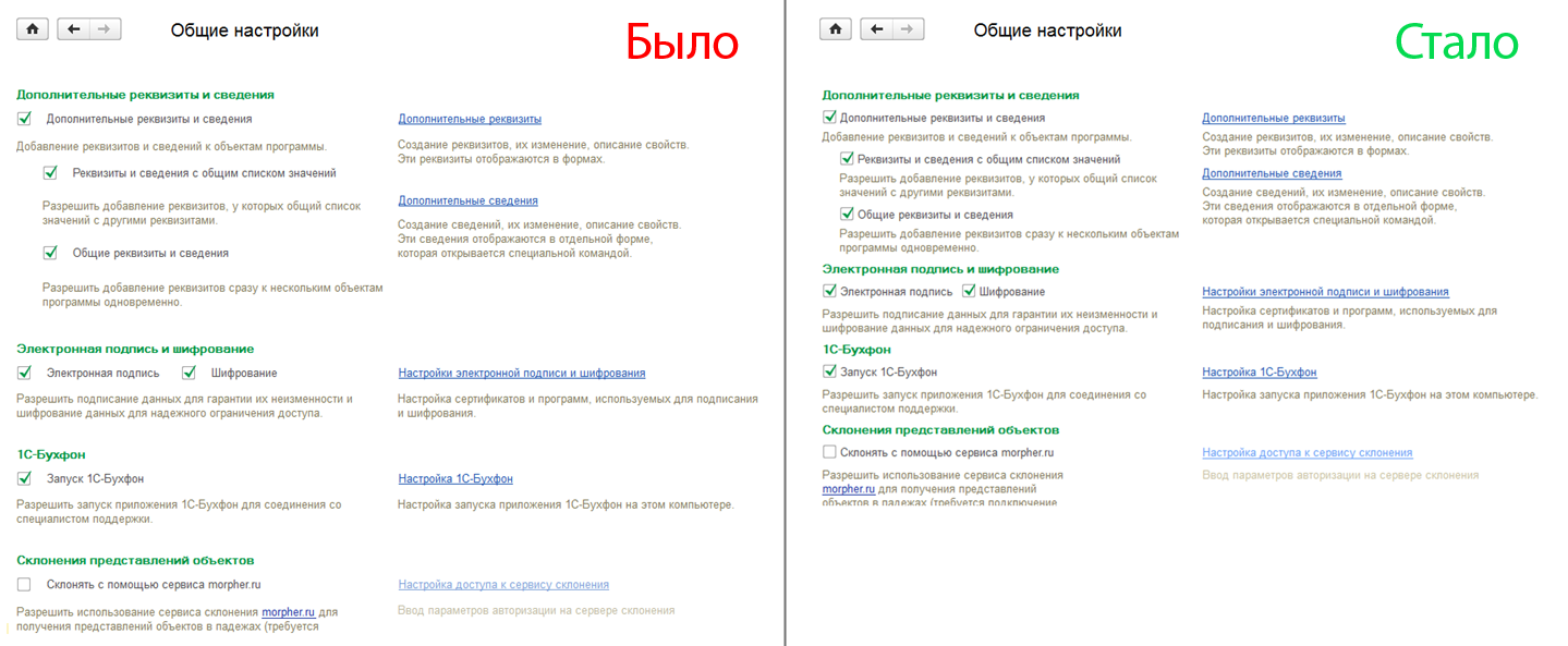 Особенностью панелей администрирования является расположение элементов в две одинаковых колонки. В "1С:Предприятии" версии 8.3.6 для выравнивания использовалась фиксированная ширина.