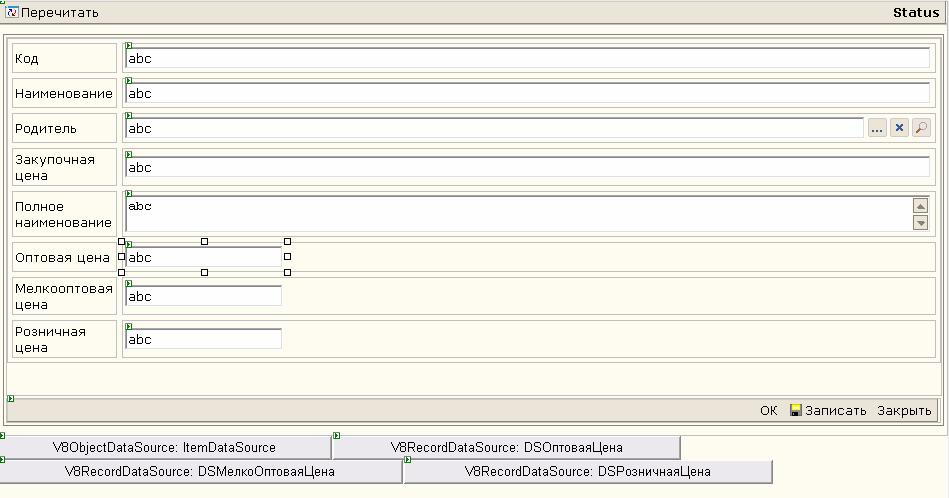 У каждого из элементов управления V8RecordDataSource в коллекцию Fields необходимо добавить элемент со свойством Name – Цена. Именно это поле мы будем редактировать при помощи нашей формы.