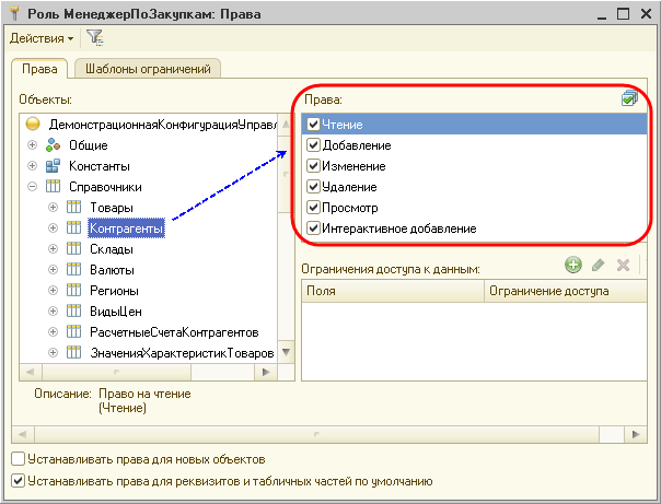 4. Откроем окно редактирования роли (например, Менеджер по закупкам) и проверим, что в правах этой роли разрешено использование искомой команды. Если речь идет о стандартной команде (например, открытия списка справочника) – нужно проверить права на сам объект.