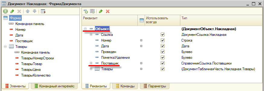 Основной реквизит формы содержит набор подчиненных реквизитов, соответствующих реквизитам прикладного объекта. Поэтому для того, чтобы обратиться, например, к номеру документа, нужно указать имя реквизита формы и через точку – имя подчиненного реквизита, хранящего номер документа.