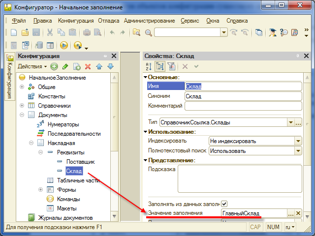 В нашем случае реквизит Склад имеет тип ссылки на справочник Склады. А в справочнике Склады существует предопределенный элемент Главный склад.