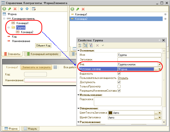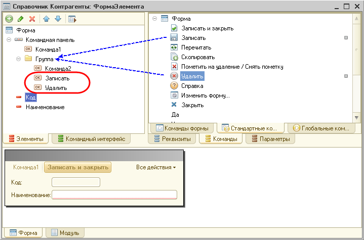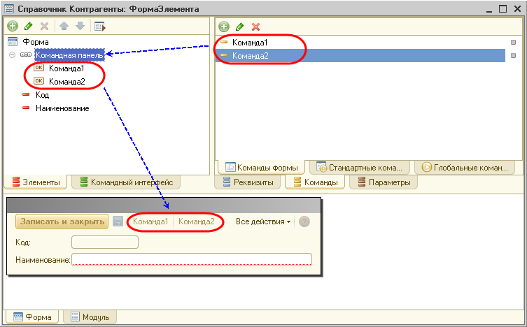 Рассмотрим самый простой вариант, когда в форме элемента справочника созданы две команды и помещены в командную панель формы.